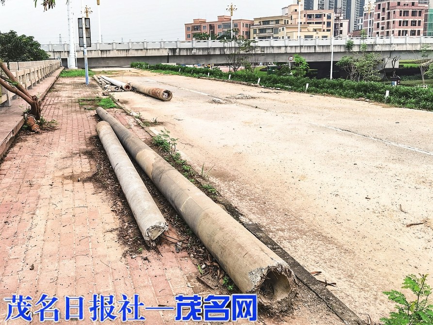 废弃电线杆被丢弃在路边。茂名晚报记者柯诗华 摄