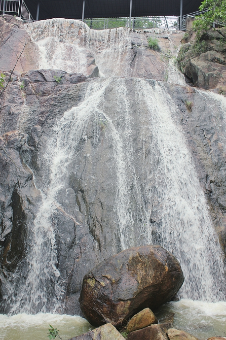 上山观景观瀑。飞鹅岭与山心岭乃化北名山,以景美树茂石奇水秀著称。两岭之间有一条登山便道,或自然土石阶梯,或人工铁质扶拦,盘旋向上,攀之颇有“扶摇直上九万里”之意境。途中有观景平台,可驻足观赏四下风光。近处,林木扶疏,花红草绿,虫鸣鸟语;远方,青山逶迤,绿野连绵,如诗如画。沿路还不时可听到流水哗哗,可见到白练闪闪,原来是一道流泉飞瀑,由山泉水汇聚而成,从山上冲泻而下,几经曲折,形成六级瀑布奇观。有数股水流贴着一面崖壁泻下,谓之“挂壁瀑布”;有水流沿着一处狭隘涧口呈线状泻下,谓之“一线天瀑布”……平流和缓之处如流泉,急流直下之处似飞瀑,正所谓张弛有度、收放自如,令人叹为观止。而流泉飞瀑所经之处,或山势峻峭,悬崖绝壁;或深潭浅氹,乱石穿空。那岩石,大小不一,形状各异,或与山岭浑然一体,恢宏大气;或突兀于急流之中,卓尔不凡,令人称绝。