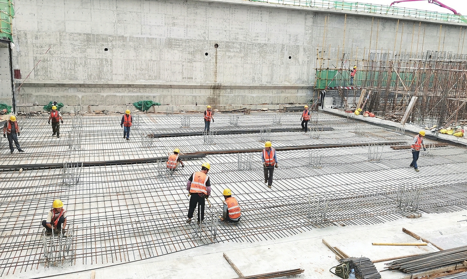 建筑人员在澄清池施工。 茂名日报社全媒体记者岑稳摄