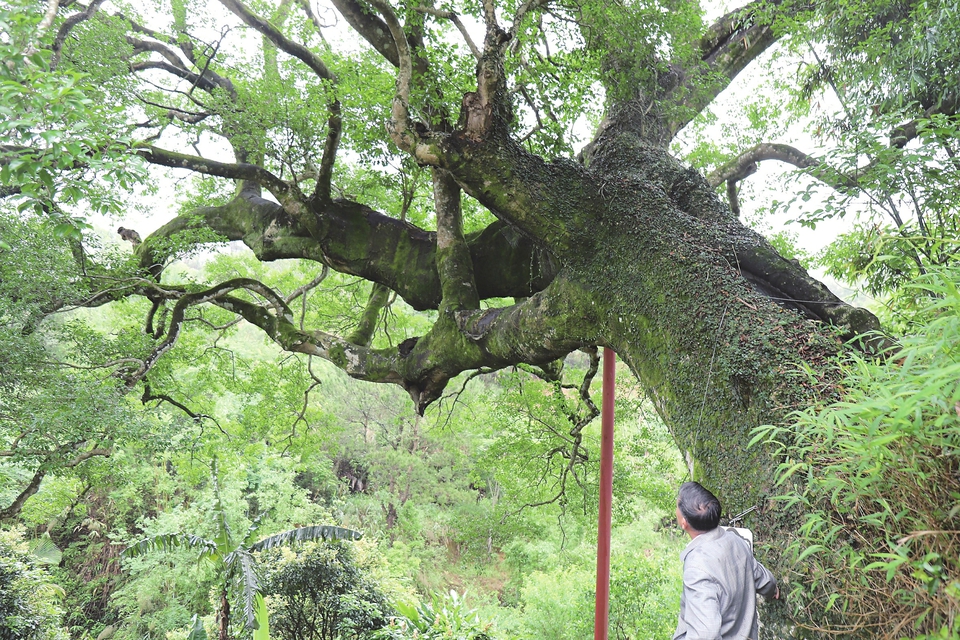 当天上午,烟雨濛濛。记者根据当地村民指点,沿着上峰村钦下自然村的村道行走,在一处山坡上看见了一棵高大的铁冬青,像一把巨大的绿色伞子,给道路留下了一片绿荫。该村群众说,铁冬青树干很大,要4个成人才能合抱一圈。记者看到,经过雨雾滋润,铁冬青树显得更加挺拔和生机勃勃,只见巨大的树干向道路的一侧舒展,枝桠巨大,纵横交错,油绿的树叶在风中上下飞舞,散发着生机活力。
