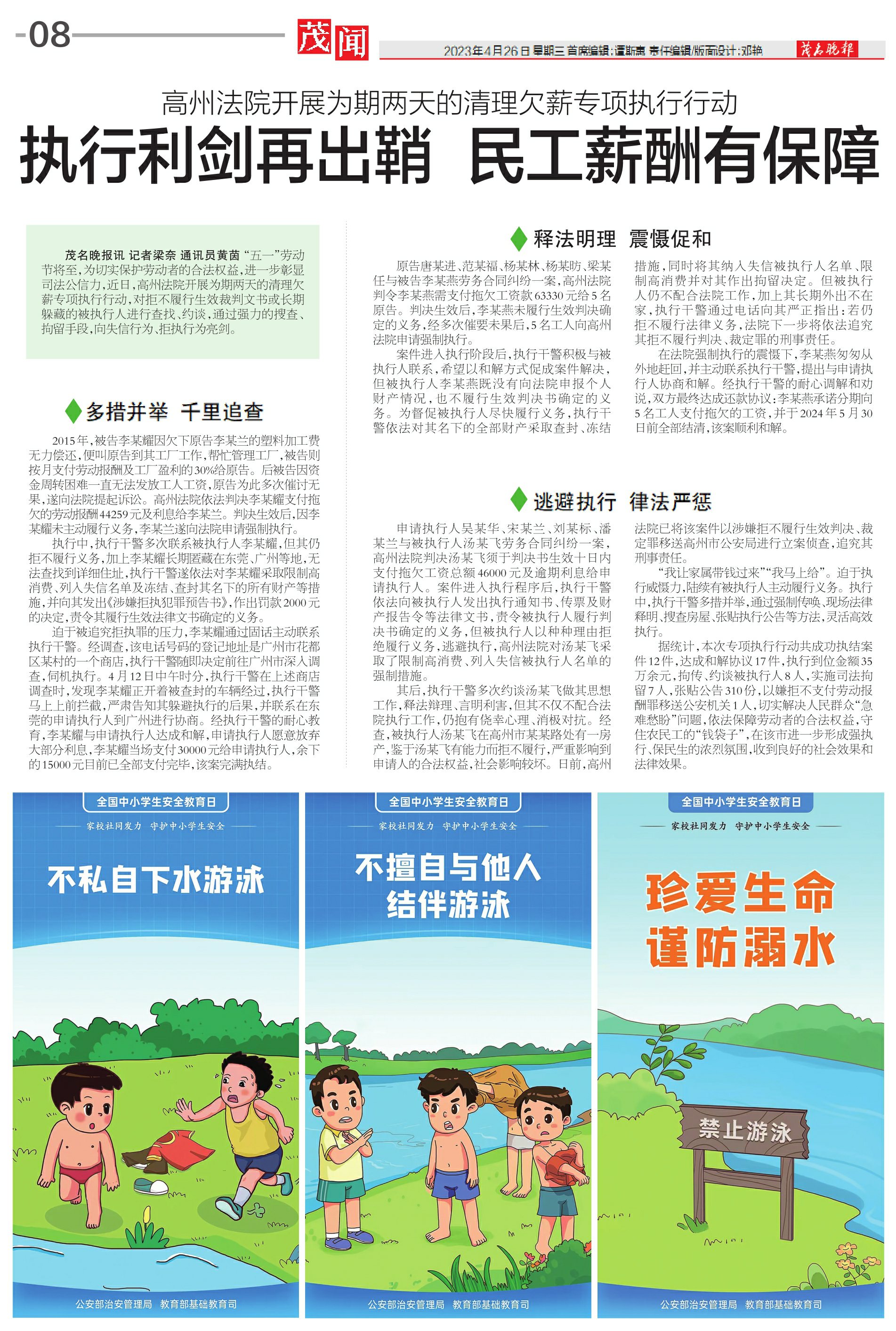 茂名晚报讯记者梁奈通讯员黄茵“五一”劳动节将至,为切实保护劳动者的合法权益,进一步彰显司法公信力,近日,高州法院开展为期两天的清理欠薪专项执行行动,对拒不履行生效裁判文书或长期躲藏的被执行人进行查找、约谈,通过强力的搜查、拘留手段,向失信行为、拒执行为亮剑。