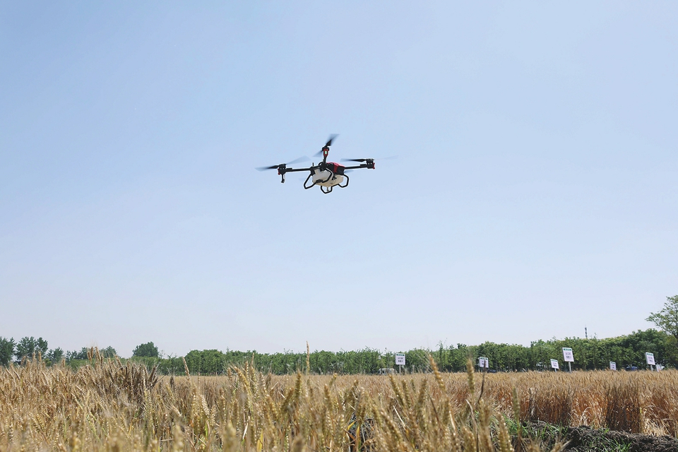 一架无人机在安徽农垦龙亢农场麦田上空进行“飞防”作业演示。新华社记者曹力摄