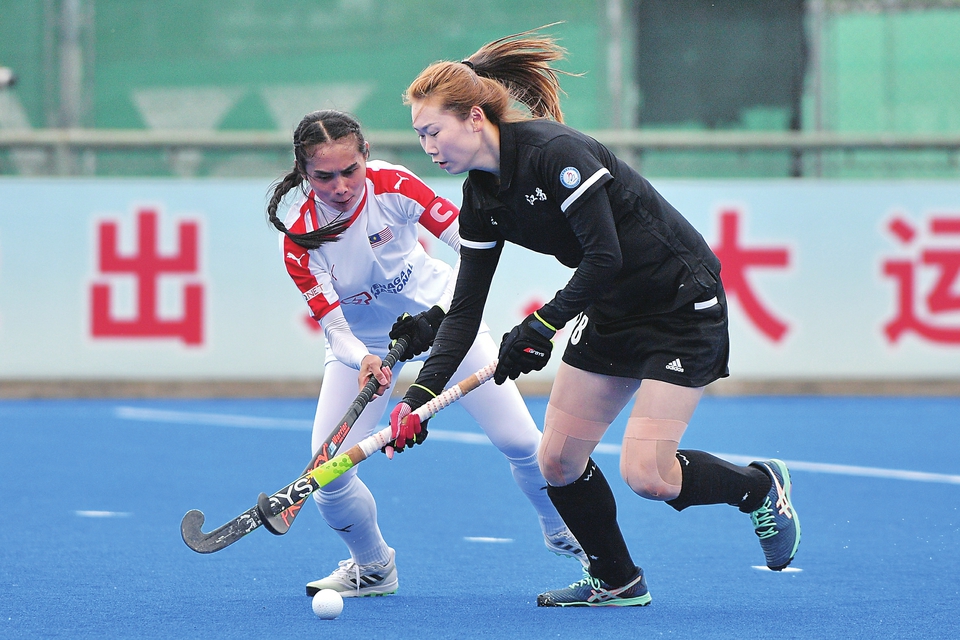 4月25日,在江苏省常州市举行的“两湖创新杯”首届女子曲棍球国际邀请赛半决赛中,江苏省女子曲棍球队以4比0战胜马来西亚女子国家队,晋级决赛。图为江苏队球员刘华(右)在比赛中拼抢。