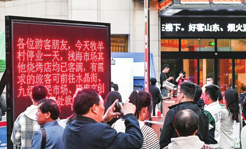4月29日,在淄博一家烧烤店前,店主通过电子屏公示停业休息信息,提醒游客合理安排行程。(董乃德摄)