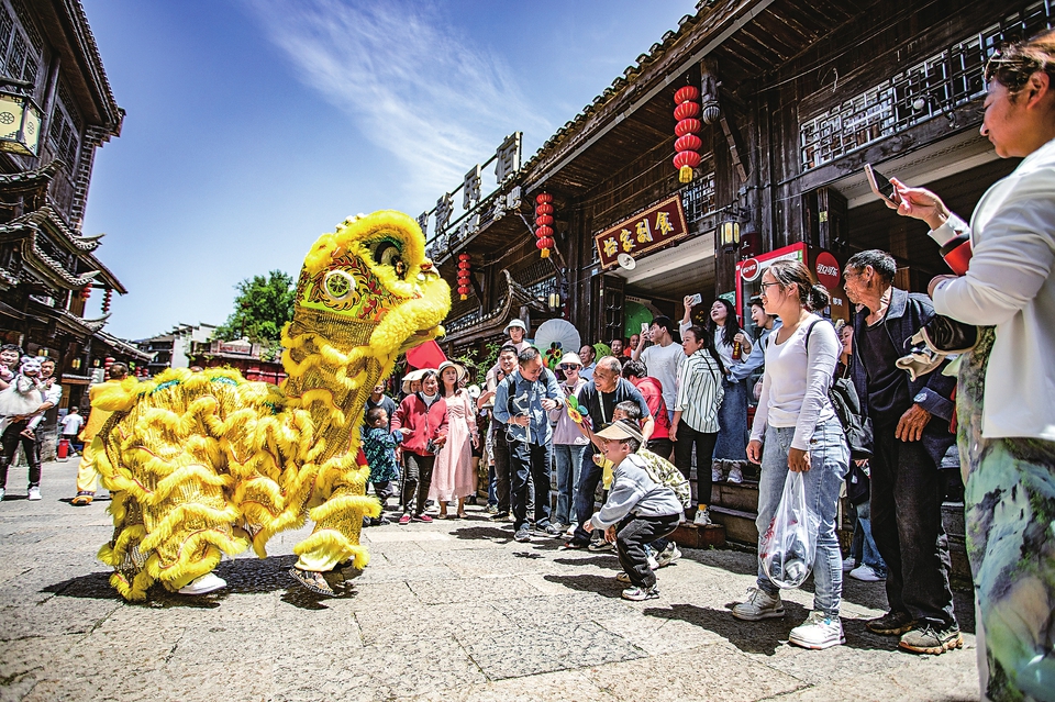 4月30日,游客在重庆市秀山土家族苗族自治县洪安镇老街观看舞狮表演。(胡程摄)