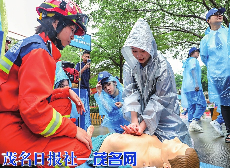接下来,由高州市消防救援大队、高州市应急救援大队和高凉应急救援大队等派出代表登台进行应急队伍展示。展示完毕后,应急专业人员现场开展一系列应急教学。在心肺复苏应急教学中,专业老师通过人体模型为大家演示急救知识,告诉大家若在户外或在医院外发现患者突然倒地并出现意识丧失、心跳骤停的状况,需及时为之进行心肺复苏。实施心肺复苏时,一般30次胸外按压后再进行2次人工呼吸为一个循环,通常需在2分钟内进行5个循环。进行5次循环后,应立即查看患者的意识、呼吸是否恢复。若并未恢复,还需继续心肺复苏。在演示救生圈、救生杆如何正确使用时,专业老师提醒同学们切莫私自到野外游泳,万一在野外有同伴发生溺水,一般可将救生圈、竹竿、木板等物抛给溺水者,再将其拖至岸边。但在投递救生杆、救生圈等时一定要注意方法,要从下游投递,并匍匐岸边将落水者拉回。此外,专业老师还讲解了预防游泳时抽筋及抽筋后的自救方法、灭火器的正确使用等知识。