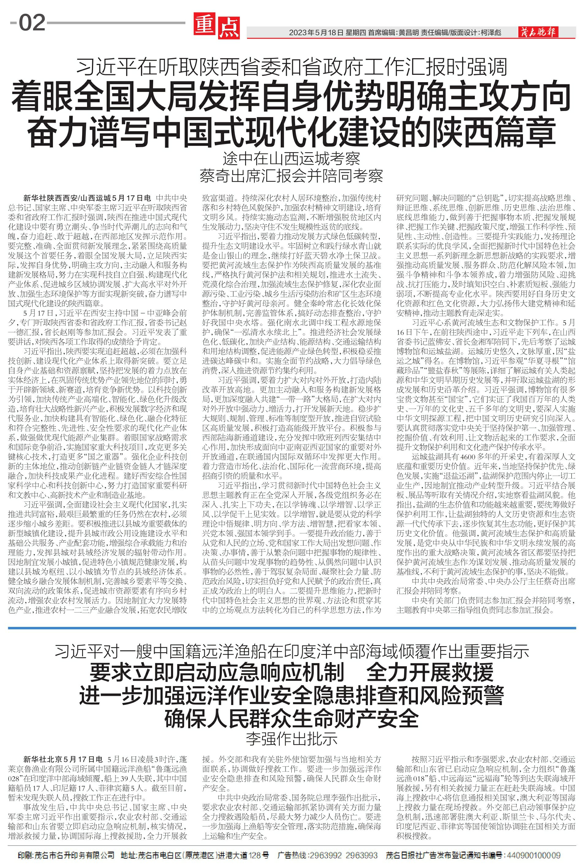 要求立即启动应急响应机制 全力开展救援 进一步加强远洋作业安全隐患排查和风险预警 确保人民群众生命财产安全