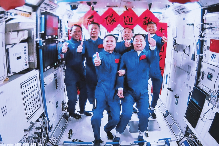 5月30日在北京航天飞行控制中心拍摄的神舟十五号航天员乘组与神舟十六号航天员乘组拍下“全家福”的画面。 新华社记者李杰摄