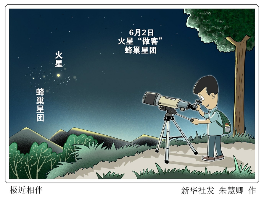 新华社天津5月31日电(记者周润健)天文科普专家介绍,6月2日傍晚,火星会进入位于巨蟹座中的蜂巢星团,这次“串门”是一次拍摄行星与深空天体极近相伴的好机会,感兴趣的公众可关注。