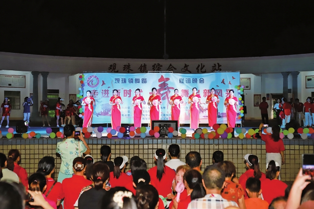 茂名晚报讯记者黄宇彬为活跃和丰富群众文化生活,推进乡村文明建设,6月1日晚,一场主题为“舞动乡村情 共建文明镇”舞蹈联谊晚会在电白区观珠镇沉香文化广场精彩上演。晚会内容精彩丰富,吸引了众多村民前来观看。