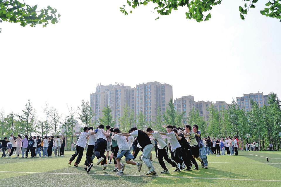 6月4日,在湖南省娄底市双峰县曾国藩高级实验中学,高三学生在做趣味游戏。 高考临近,湖南省娄底市双峰县曾国藩高级实验中学组织高三学生开展多种趣味游戏活动,帮助学生释放身心压力,迎接高考。 新华社发(李建新摄)
