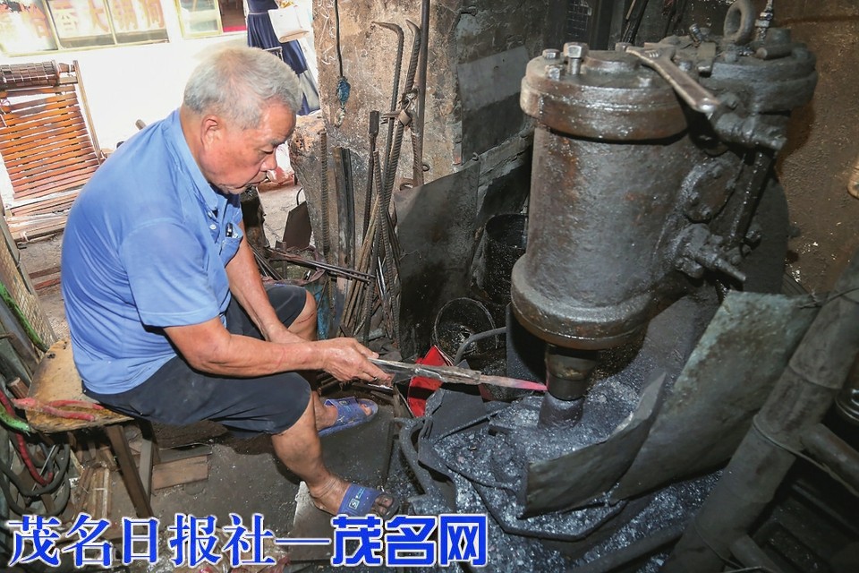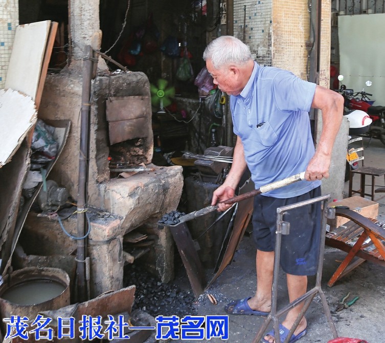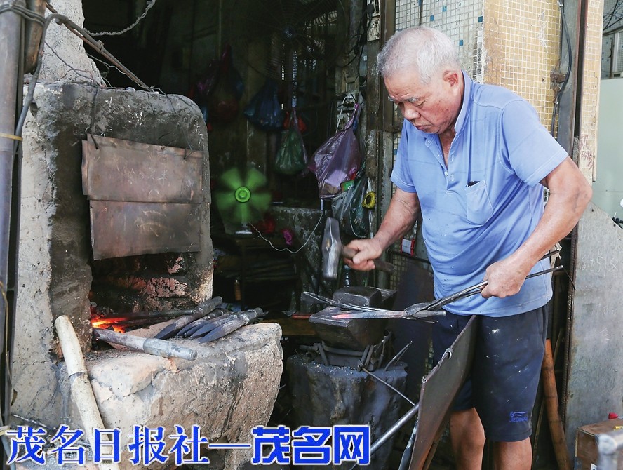 夏日的午后,天气炎热,空气中没有一丝风,许多人在空调房里依然觉得热。然而在茂南区河西农贸市场旁的白银街打铁铺里,76岁的打铁匠柯旦家站在炙热的火炉旁,抡起铁锤不停地敲打着被烧得通红的铁器。“铛铛铛”敲打的声音清脆响亮,在铁匠这一老行当逐渐远离人们生活的时候,柯旦家始终舍不得放下手中那把打铁锤。