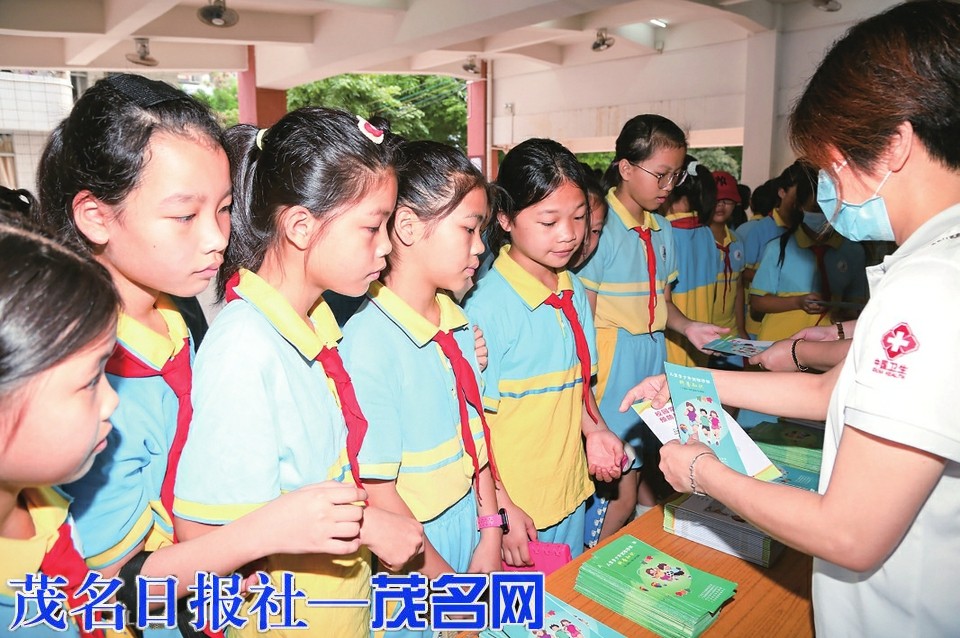 志愿者向学生派发宣传资料。茂名日报社全媒体记者李颜东摄