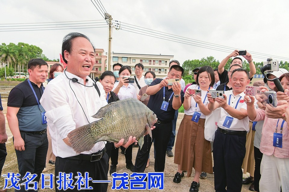 嘉宾们纷纷拿出手机,拍下这条“巨型”罗非鱼。茂名日报社全媒体记者甘杨松岑稳吴昊摄