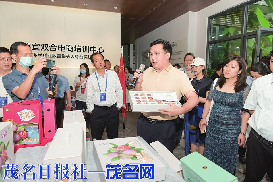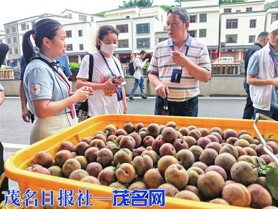 在双合村电商中心,领导嘉宾们对展示的信字号“银妃”三华李非常感兴趣。信宜是全国最大的三华李生产区,全市三华李累计种植面积32.71万亩,预计今年总产量超32万吨。钱排镇作为中国三华李第一镇,种植面积达10.2万亩,年产量12万—15万吨(今年预计产量约14万吨)。近年来,信宜市委、市政府创新思路,以数字化全程赋能三华李销售,着力构建三华李品控溯源体系,通过推行“两标一码一单”销售,提高“银妃”三华李的识别度,引进阿里巴巴、腾讯、碧桂园等大型企业,线上线下销售“信字号”农产品。截至5月31日,已完成钱排镇15个行政村1500多户种植户“银妃”商标授权工作,“信字号”覆盖3000吨。