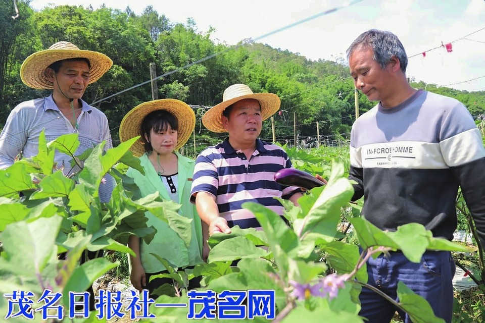 镇村干部深入田间地头察看茄瓜生长情况。通讯员王庆珍 摄