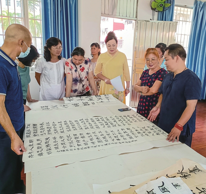 茂名市油城老年大学师生在研究参赛作品。 通讯员柯丽明摄