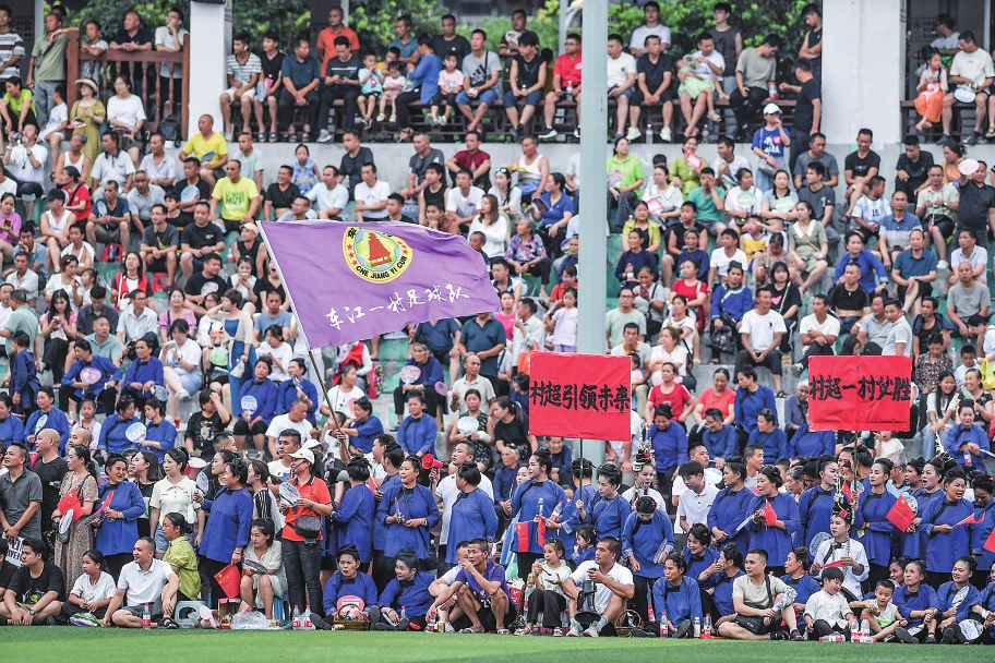 丰乐村村民姚吉仙是村里的一位保洁大姐,她的助威方式是身背喷雾器,在场上演绎平时的工作场景。“拿西瓜的、扛锄头的、挑担子的、敲锅盆的……我们想了各种各样的表现方式,最后决定根据自己的职业选择道具。”她说。