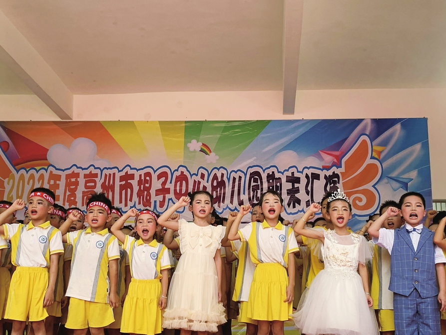 高州市根子镇中心幼儿园的小朋友宣誓做好暑假安全防护。通讯员陈华摄