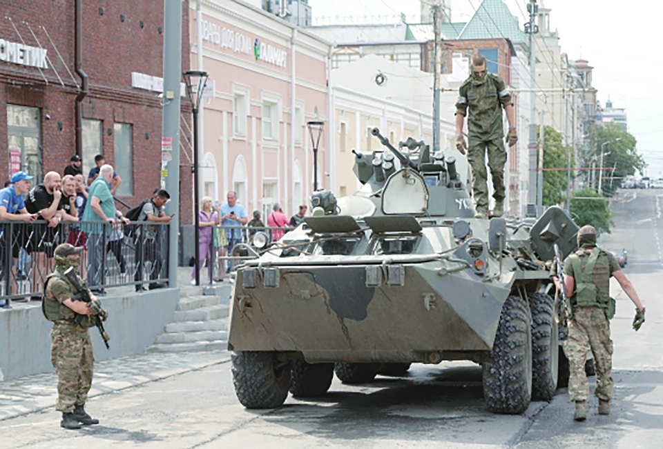 6月24日在俄罗斯顿河畔罗斯托夫拍摄的瓦格纳组织武装人员及装甲车辆。新华社/塔斯社