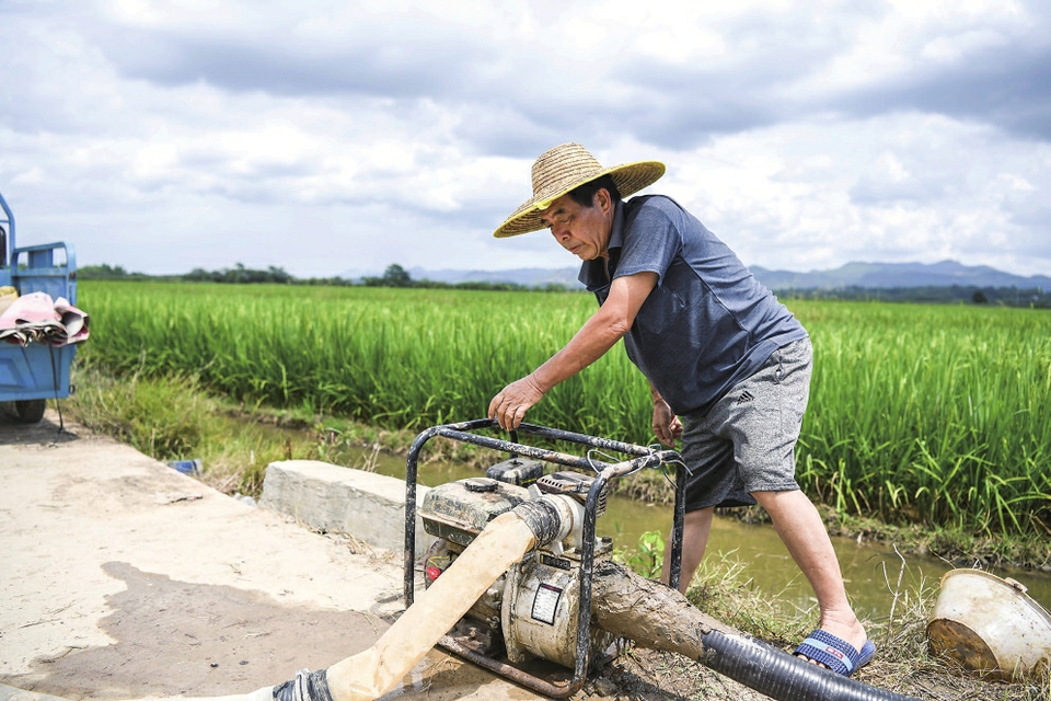 ▶6月7日,在广西崇左市宁明县明江镇峙利村,村民使用抽水设备浇灌稻田。 新华社记者曹祎铭摄