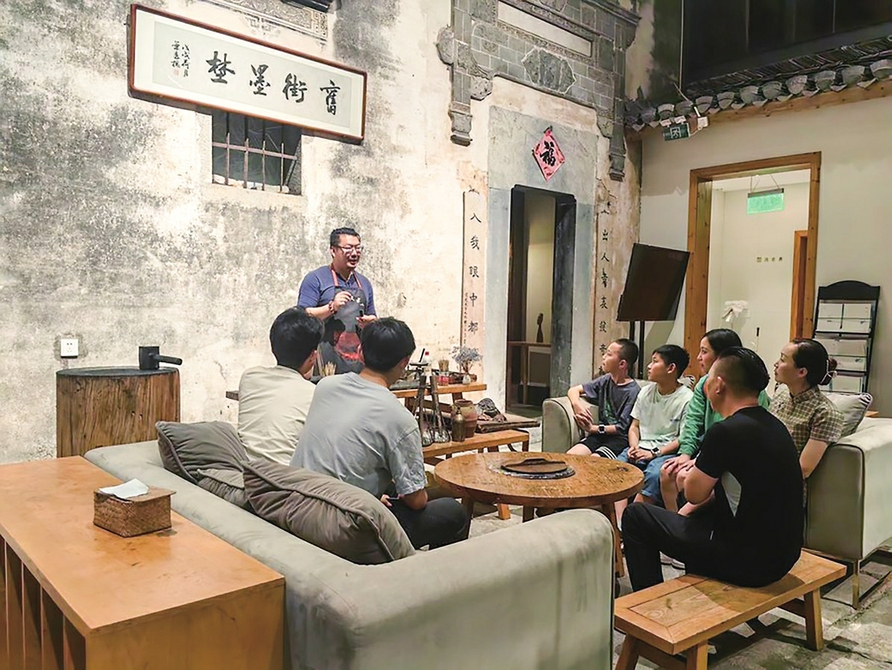 在安徽省黄山市黟县,民宿管家申易鑫在民宿内为住客讲解徽墨制作技艺。新华社记者汪海月摄