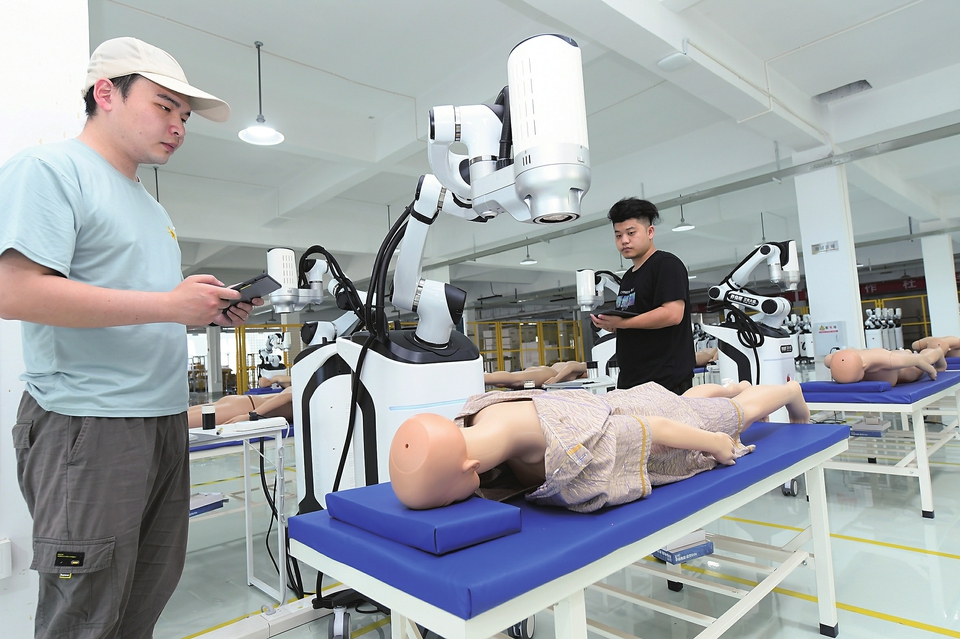 ▲7月4日,在位于浙江仙居县的浙江千域智能科技有限公司,工作人员调试一款智能艾灸机器人。新华社记者翁忻旸摄