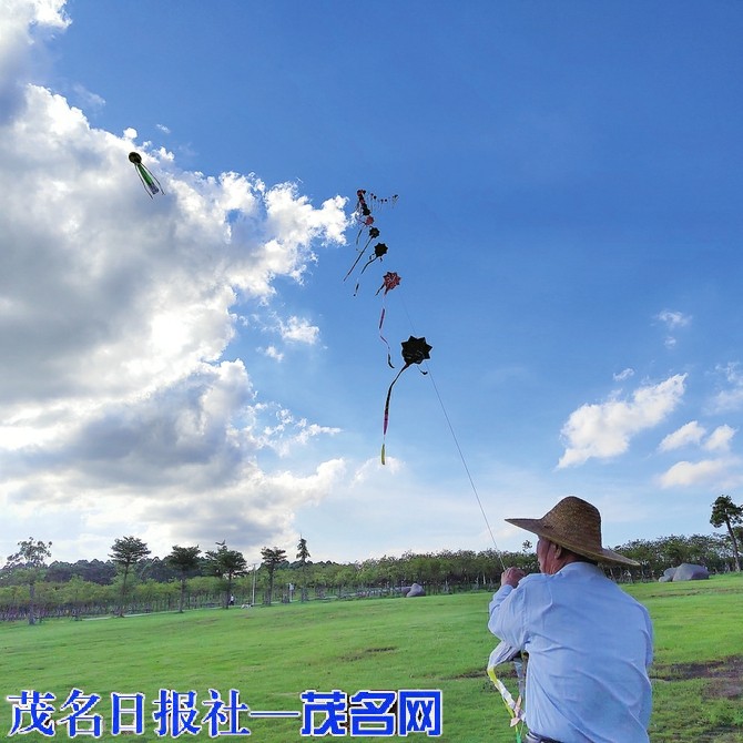 昨天下午,好心湖东侧的碧道边空旷草地上,郑叔将60只风筝放上了天,吸引了不少小朋友驻足观看。郑叔对记者说,他的风筝是利用垃圾袋制作的,在一条粗线上,每隔4米就装一个,一线串起了60个风筝。郑叔说,当天的风大了些,放风筝最好就是二级风。记者拉了一下他的风筝绳,甚觉吃力。茂名晚报记者李光耀摄