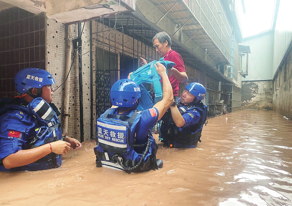 7月4日,蓝天救援队队员在重庆市万州区五桥街道转移被困群众。 新华社发(冯涛摄)