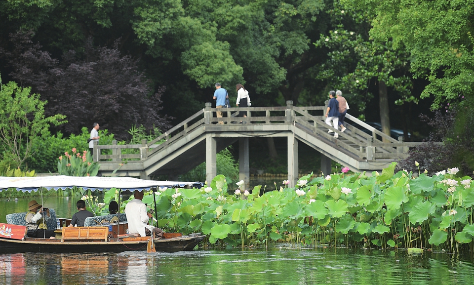 游客在杭州西湖曲院风荷观赏荷花。新华社记者翁忻旸摄