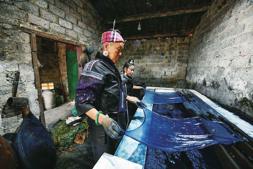 ▲潘玉珍(前)与女儿张艳梅在染布。新华社记者 杨文斌摄