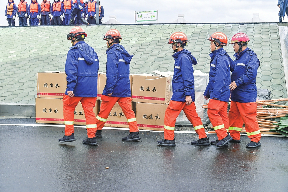 消防人员到容易出现险情的江边集合待命。