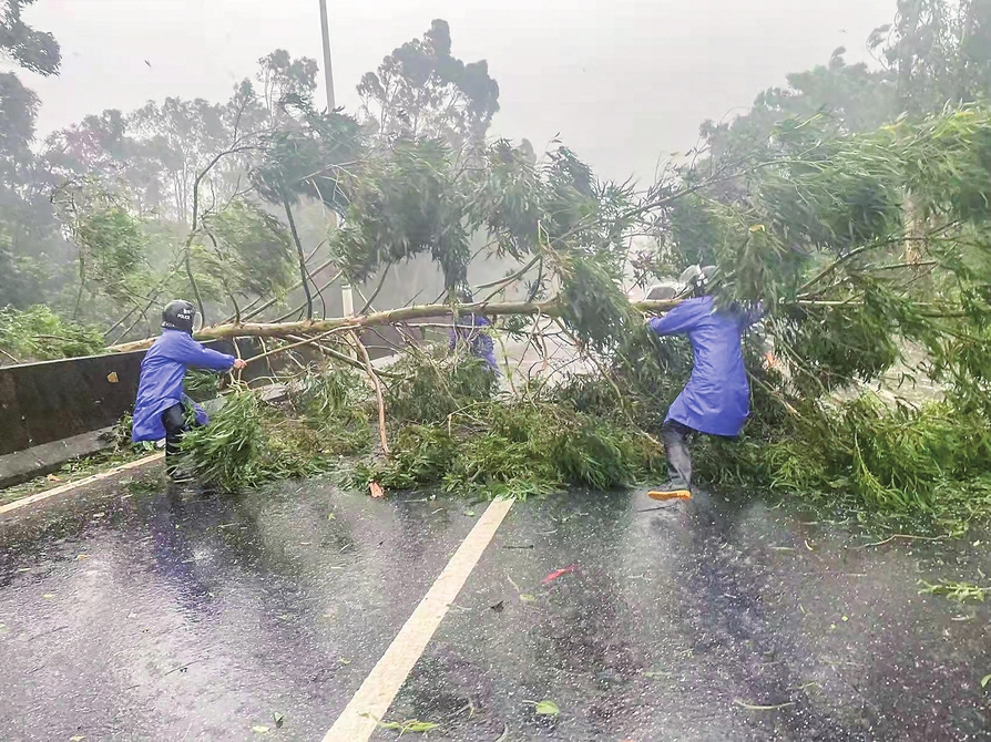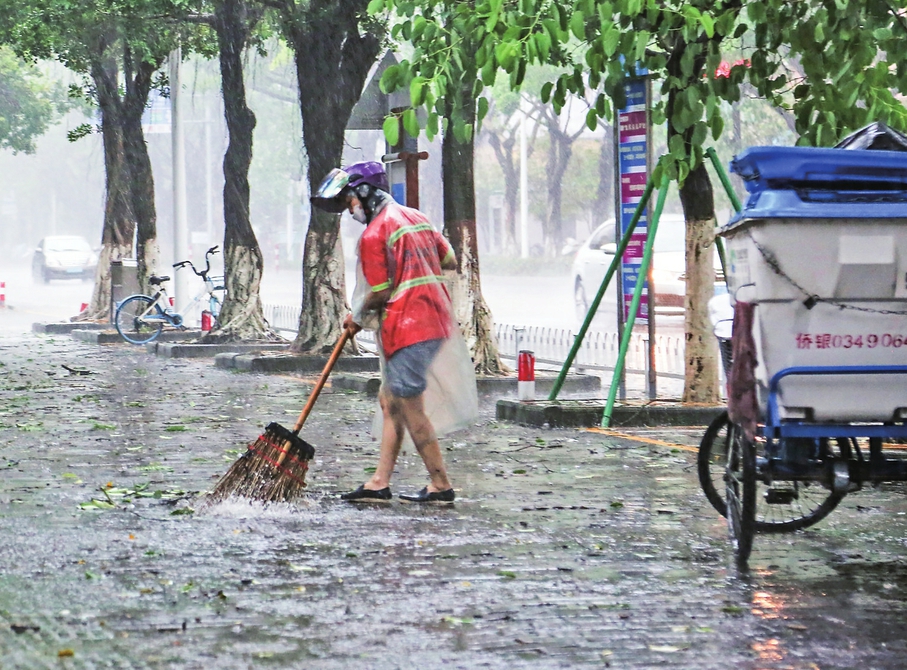 环卫工人在风雨中坚守岗位。茂名日报社全媒体记者岑稳摄