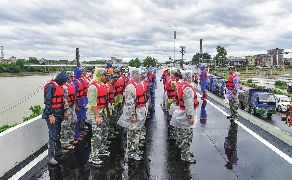 鳌头镇民兵冒雨待命。茂名日报社全媒体 记者丘立贺摄