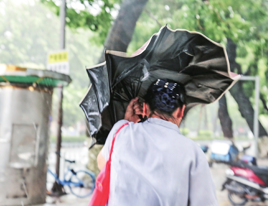 7月17日下午,受台风“泰利”影响,茂名市区风力明显增强,市民在风雨中打伞出行。 茂 名 日报社全媒体记者岑稳摄