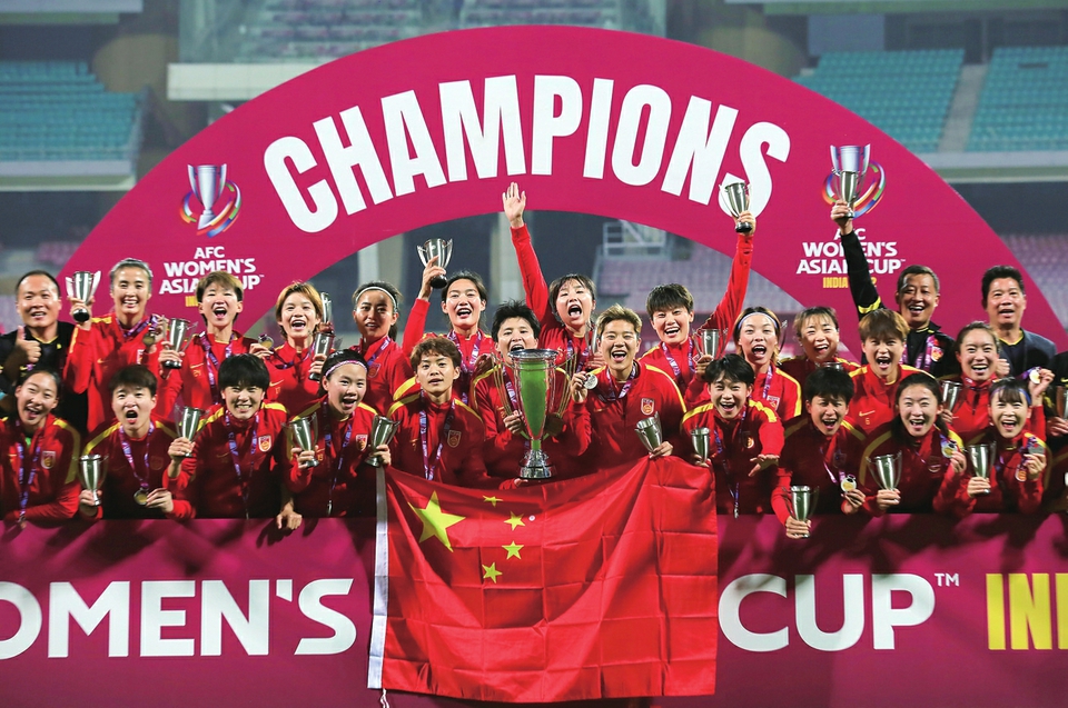 2022年2月6日,中国队在女足亚洲杯颁奖仪式上庆祝。新华社发(贾韦德·达尔摄)