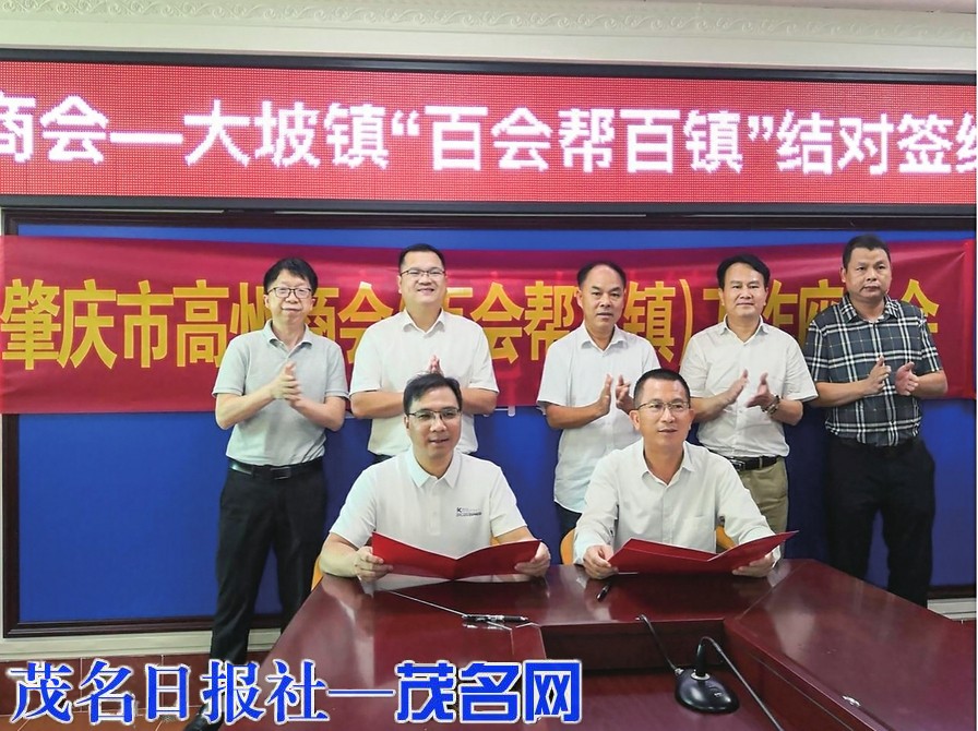 茂名晚报讯 通讯员梁敏娴 为贯彻落实习近平总书记考察广东、考察茂名重要讲话重要指示精神,为高州“百会帮百镇”工作贡献大坡力量,7月22日上午,肇庆市高州商会与高州市大坡镇召开座谈会并签订“百会帮百镇”合作协议,旨在实现“商会+乡镇”乡村振兴同频共振、互促共融。
