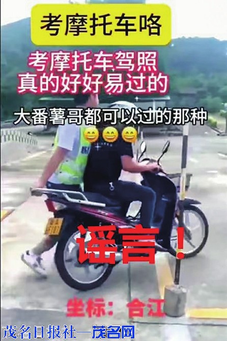 7月21日中午,在某音平台流传出一段短视频,视频里一个穿着绿色反光衣的男子,其用手拖着另一个男子驾驶摩托车过考试杆,并配有字幕“考摩托车咯”“考摩托车驾照真的好好易过的”“大番薯哥都可以过的那种”,上面还标有醒目的红色字体“坐标:合江”,视频引起了恶劣的社会影响。