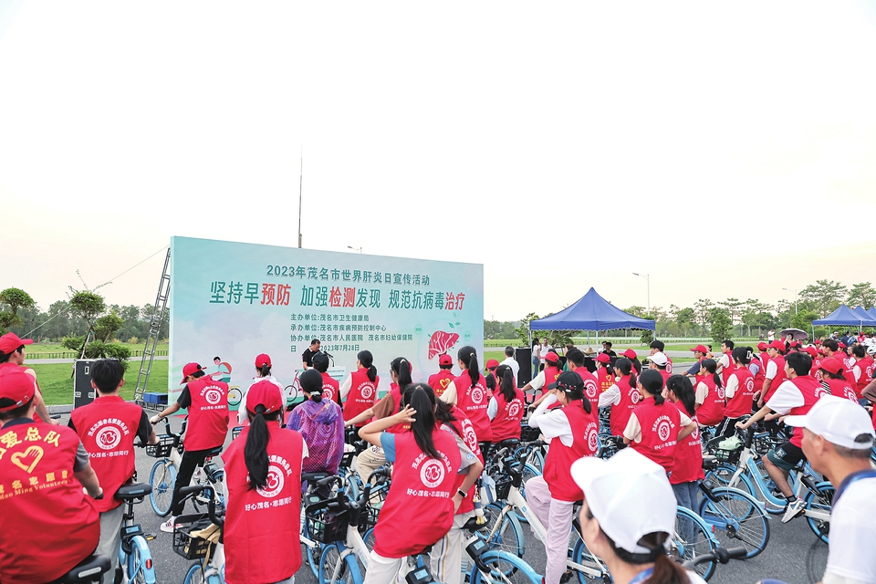 茂名晚报讯 记者张丁文 通讯员邝庭欣 罗丽华实习生甘晓露 7月28日,2023年茂名市世界肝炎日宣传活动在露天矿生态公园正式开启,300位市民齐聚露天矿生态公园好心湖畔,用环好心湖骑行的方式助力宣传病毒性肝炎防治。