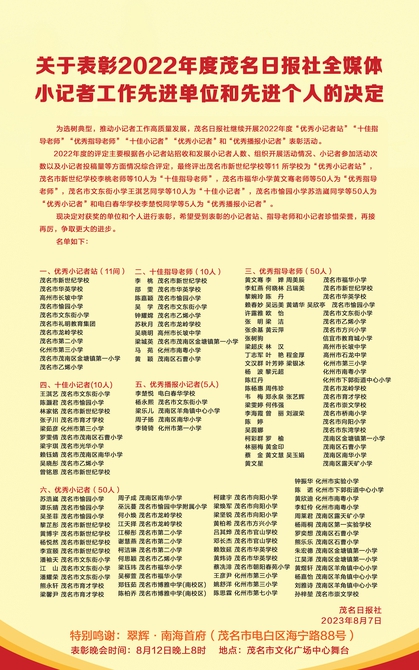 关于表彰2022年度茂名日报社全媒体小记者工作先进单位和先进个人的决定