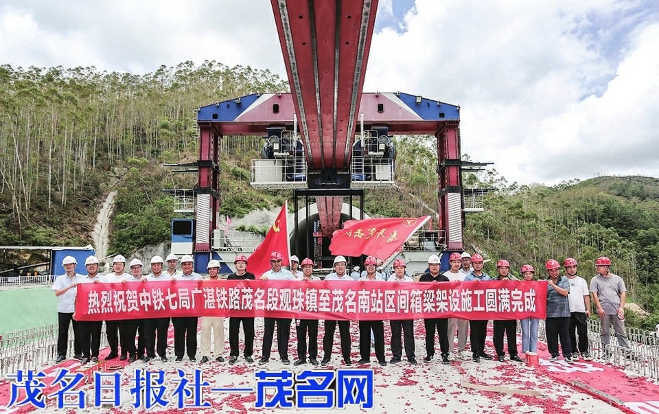 茂名晚报讯记者梁奈通讯员赵俊卿任飞飞 昨日上午,随着最后一榀830吨32米箱梁稳稳地落在老虎径岭中桥桥台上,标志着由广湛公司建设、中铁七局施工的广湛铁路茂名段观珠镇至茂名南站区间箱梁架设施工圆满完成。至此,广湛八标广州方向581孔箱梁架设施工任务顺利完成,为加快推进桥梁桥面系施工及后续铺轨作业提供有力保障,为广湛高铁早日通车再创新绩。
