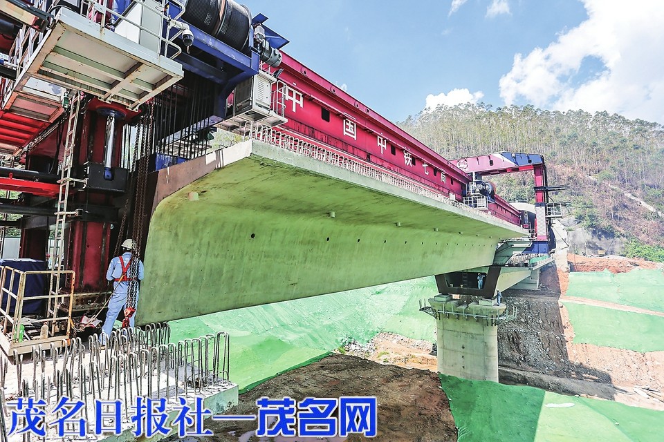 ▲ 昨日,广湛铁路茂名段观珠镇至茂名南站区间箱梁架设施工顺利完成。