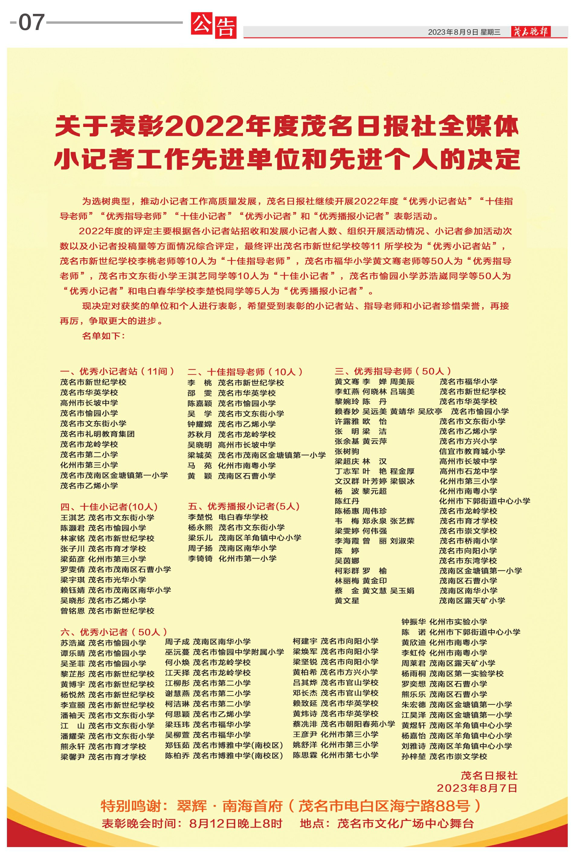 关于表彰2022年度茂名日报社全媒体小记者工作先进单位和先进个人的决定