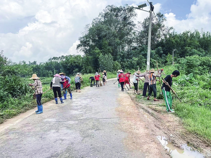 义工和村民齐动手美化乡村环境。 茂名晚报记者张富摄