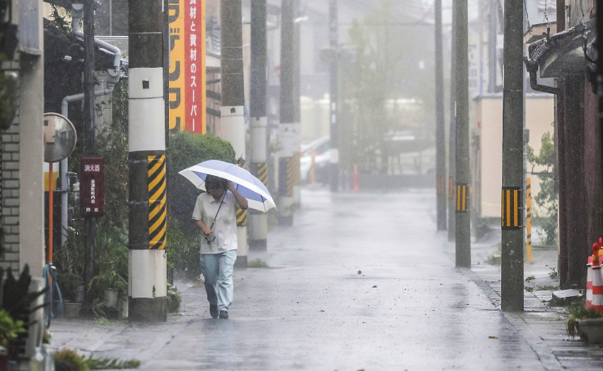 8月15日,一名女子在日本和歌山县田边市街头冒雨出行。(新华社/共同社)