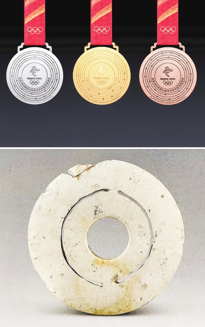 拼版照片:上图为北京冬奥会奖牌(背面)(北京冬奥组委供图);下图为凌家滩遗址出土的双连璧。 (凌家滩遗址管理处供图)新华社发