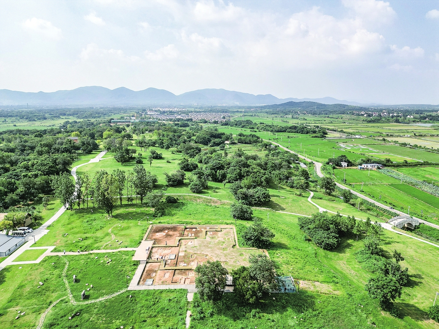 凌家滩遗址,林木环抱,满目葱茏,成片的狼尾草像绿色地毯一样在遗址周围铺开。远处,一行白鹭在荷塘间振翅而起。