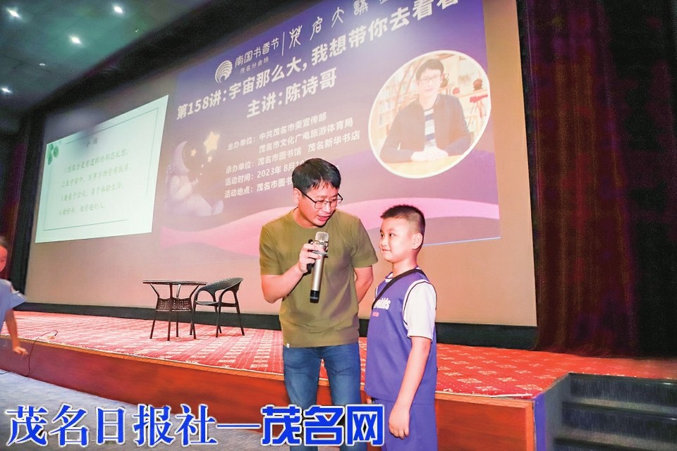 茂名晚报讯记者张丁文 8月19日下午,“茂名大讲堂”第158讲在茂名市图书馆1号报告厅举行,正值南国书香节期间,儿童文学作家陈诗哥以“宇宙那么大,我想带你去看看”为主题,带领现场的小朋友们一起畅游童话世界,放飞想象力和创造力。