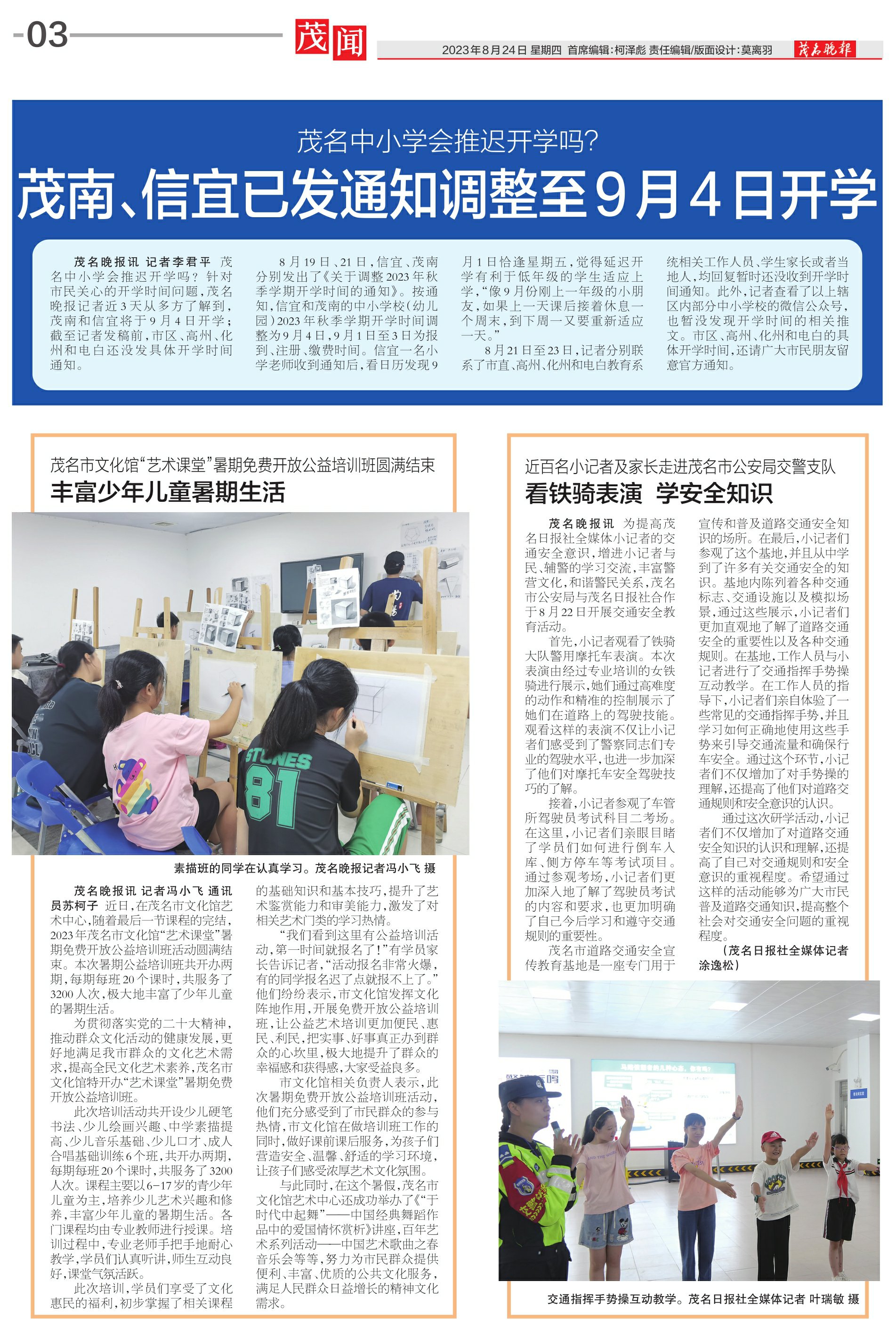 8月19日、21日,信宜、茂南分别发出了《关于调整2023年秋季学期开学时间的通知》。按通知,信宜和茂南的中小学校(幼儿园)2023年秋季学期开学时间调整为9月4日,9月1日至3日为报到、注册、缴费时间。信宜一名小学老师收到通知后,看日历发现9月1日恰逢星期五,觉得延迟开学有利于低年级的学生适应上学,“像9月份刚上一年级的小朋友,如果上一天课后接着休息一个周末,到下周一又要重新适应一天。”