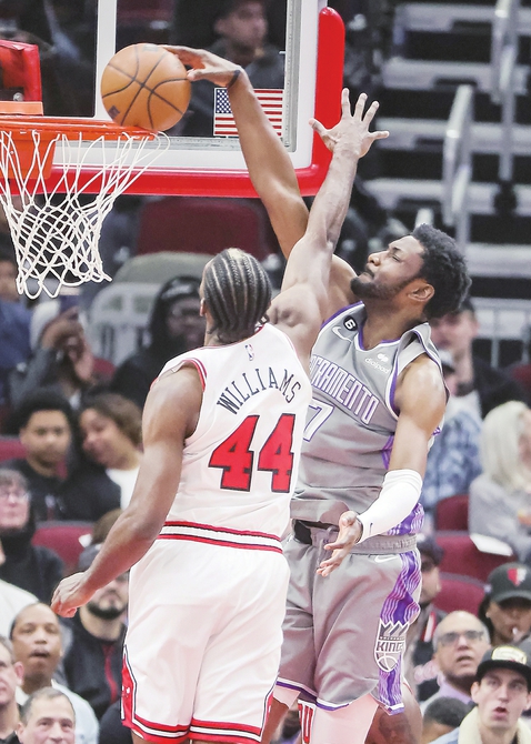 3月15日,效力于萨克拉门托国王队的爱德华兹(右)在比赛中扣篮。当日,在2022-2023赛季NBA常规赛中,萨克拉门托国王队客场以117::114战胜芝加哥公牛队。新华社发(乔尔·莱纳摄)